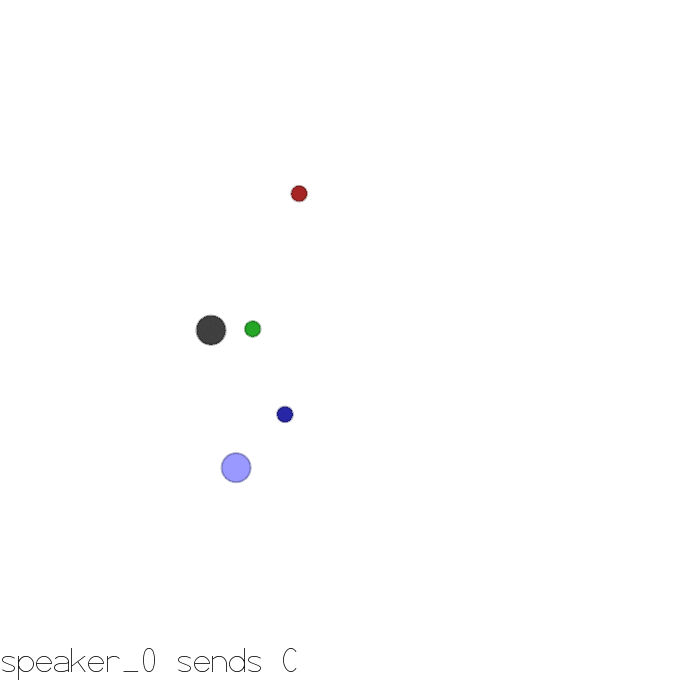 This environment is similar to simple_reference, except that one agent is the ‘speaker’ (gray) and can speak but cannot move, while the other agent is the listener (cannot speak, but must navigate to correct landmark).